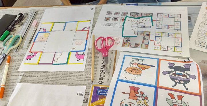 今日は『絵あわせパズルを作ろう!!』ということで、工作を行いました。 まず絵あわせパズルに必要な6枚の絵を作成することから始めました。アンパンマンなどの絵と自分で書いた絵を組みあわせ、オリジナルパズルを作ることとしました…